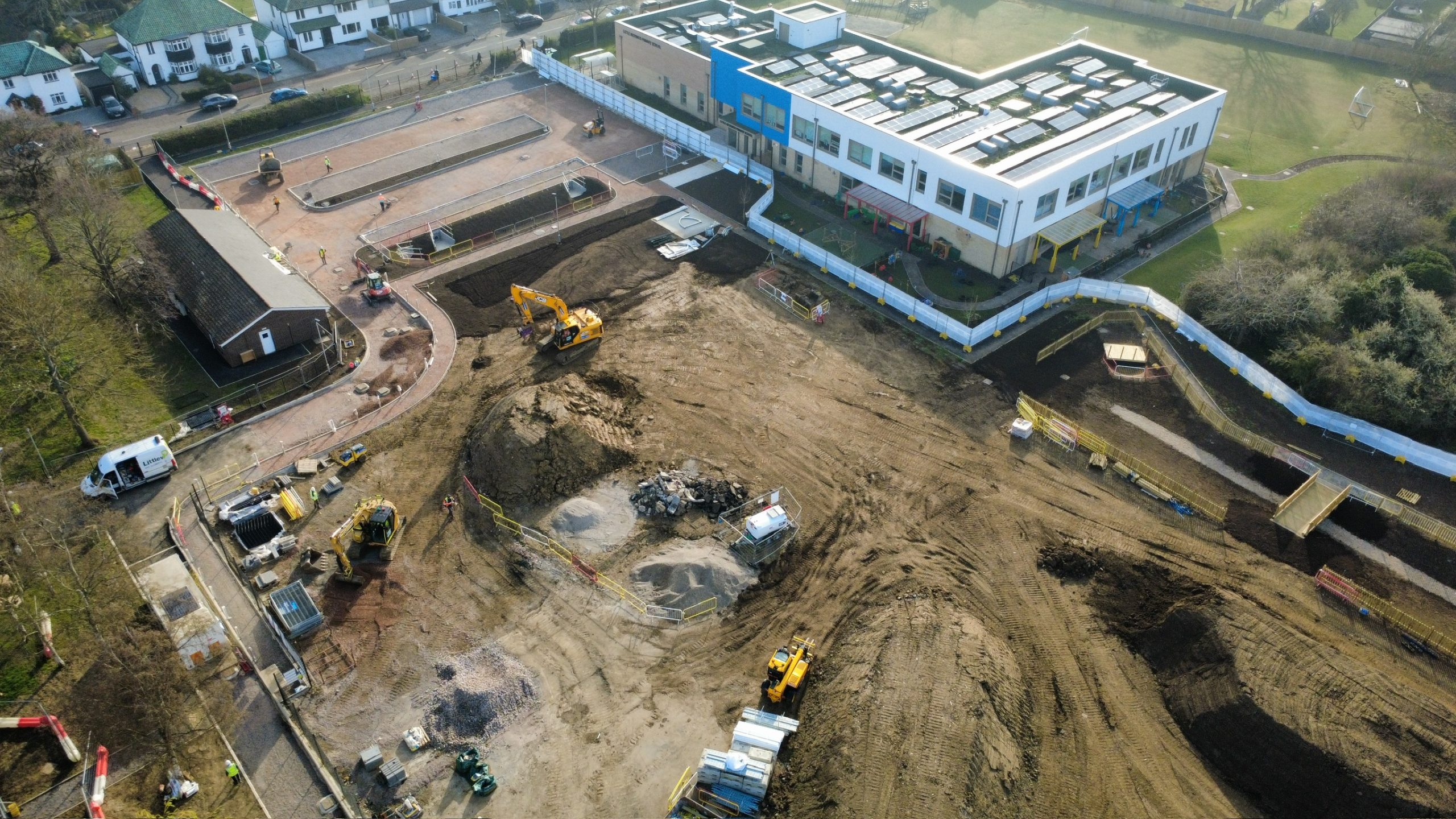 The inclusion of a sustainable swale system for surface water drainage ensures long-term environmental resilience, while integrated foul and surface drainage, complete with manholes, ACOs, and flow control devices, supports efficient water management. Trenching for utilities, foundations for cycle stores and bollards, plus paving, kerbing, tree pits, and landscaping groundwork, all contribute to a safe, accessible, and aesthetically pleasing school campus.